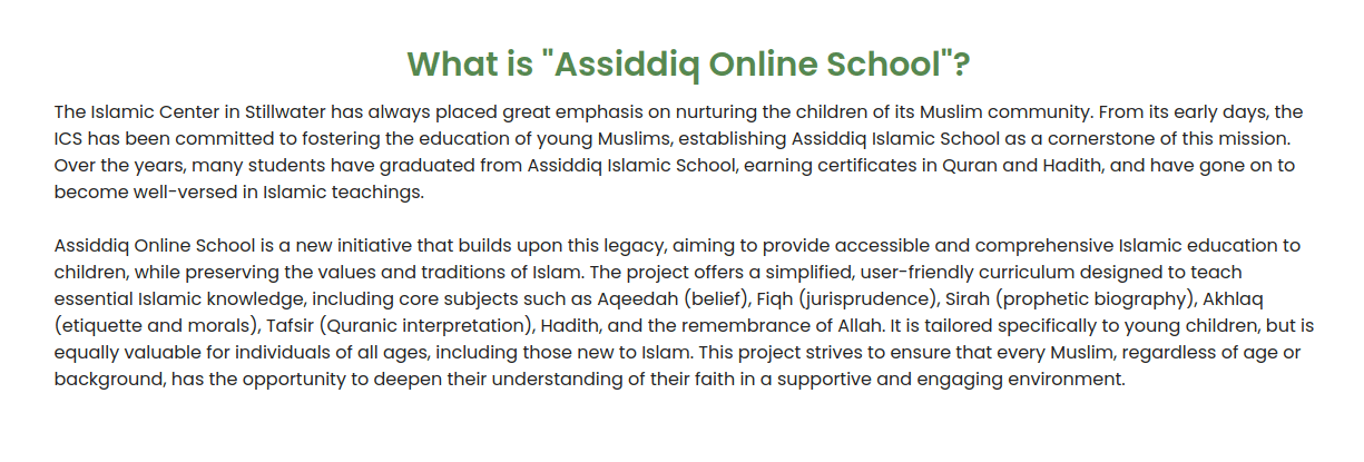 The Islamic Center in Stillwater has always placed great emphasis on nurturing the children of its Muslim community. From its early days, the ICS has been committed to fostering the education of young Muslims, establishing Assiddiq Islamic School as a cornerstone of this mission. Over the years, many students have graduated from Assiddiq Islamic School, earning certificates in Quran and Hadith, and have gone on to become well-versed in Islamic teachings.