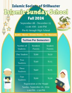 The Education Committee is pleased to announce that the Islamic Sunday School (Assiddiq School) will begin on Sunday, September 8th, in shaa Allah. The school welcomes students from pre-K through high school. School’s curricula include four subjects: Qur’an, the Arabic Language, Islamic Studies, and An-Nourania. For information about tuition fees for the Fall semester, please refer to the picture below, or click here (or click the image).