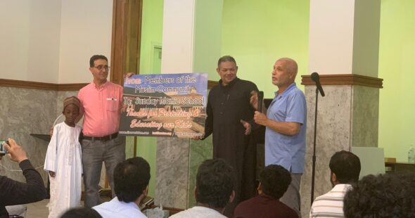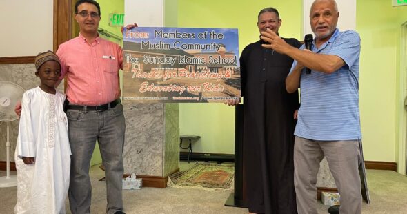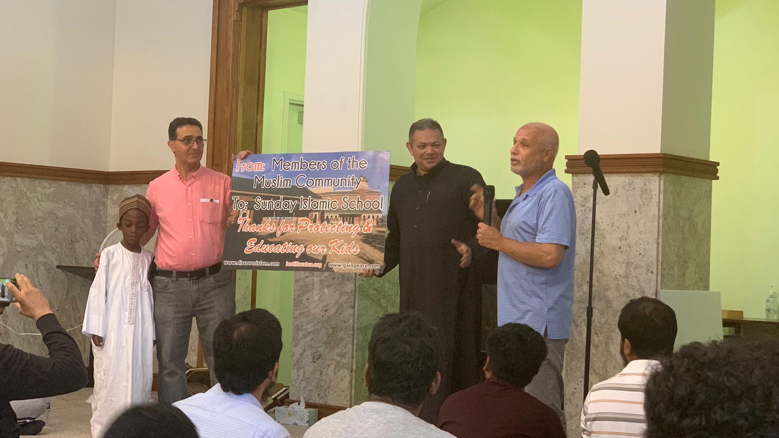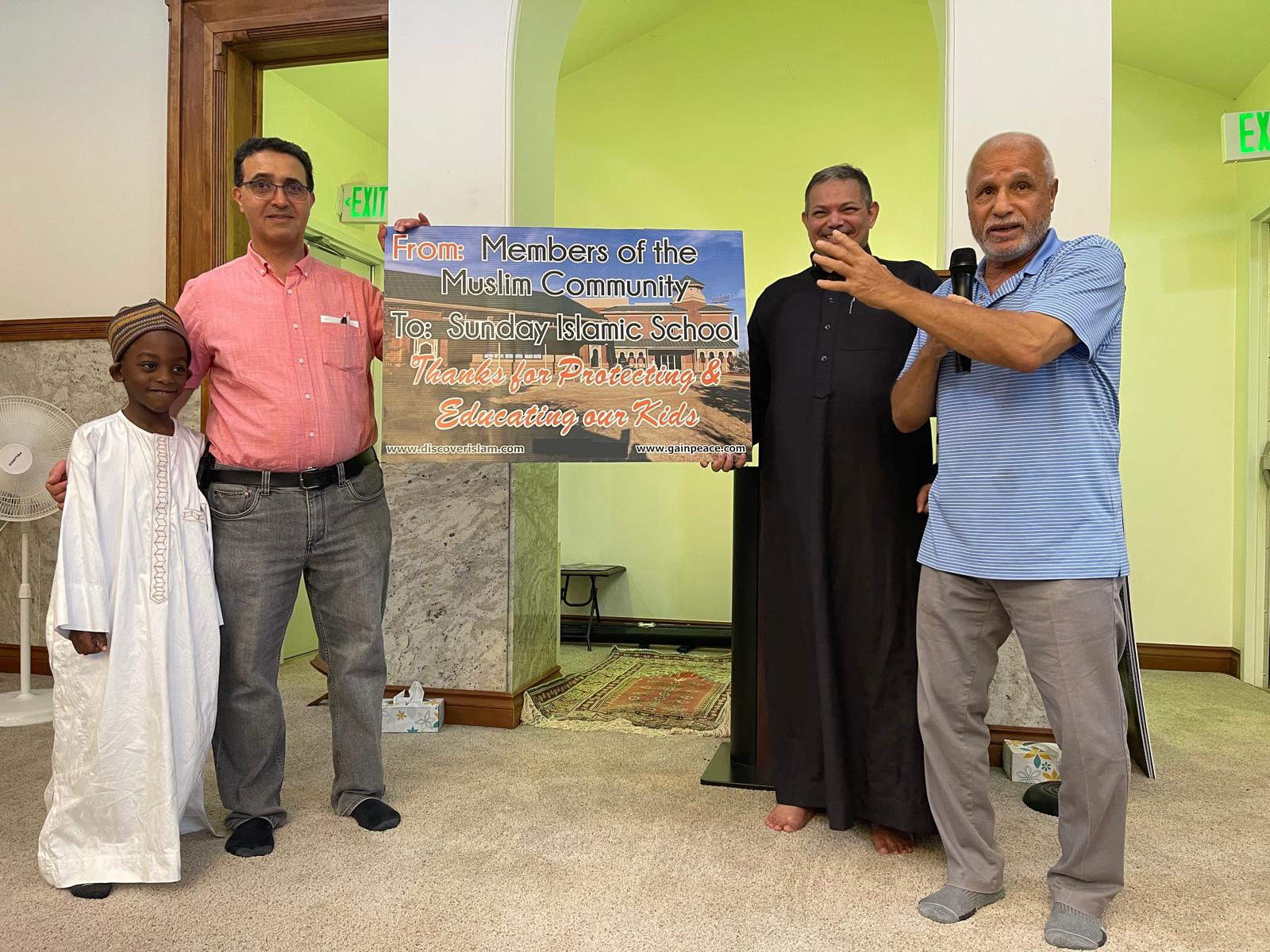 Alhamdulillah, in a joyful and pleasant atmosphere that our community enjoys these days, May Allah bless us with more of these days extending their joyful reasons, Dr. Ahmed Abo Basha presented Dr. Hasan Atiya, the Sunday Islamic School Director, with a token of appreciation for his and his family’s outstanding and remarkable contributions.