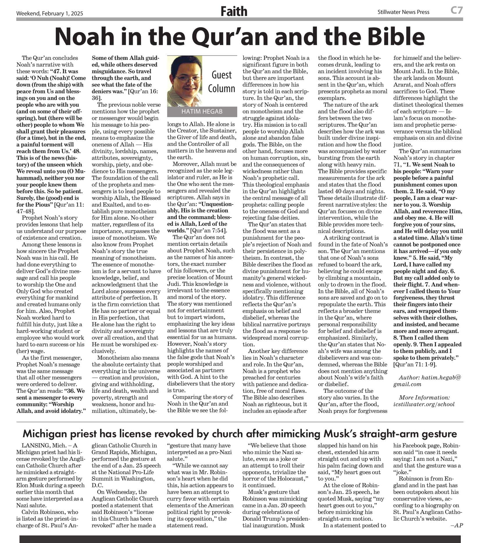 Dr. Hatim Hegab continues to contribute to the Faith page of the local newspaper, “The Stillwater News Press.” In his latest article, he talks about “Noah (pbuh) in the Qur’an and in the Bible”: