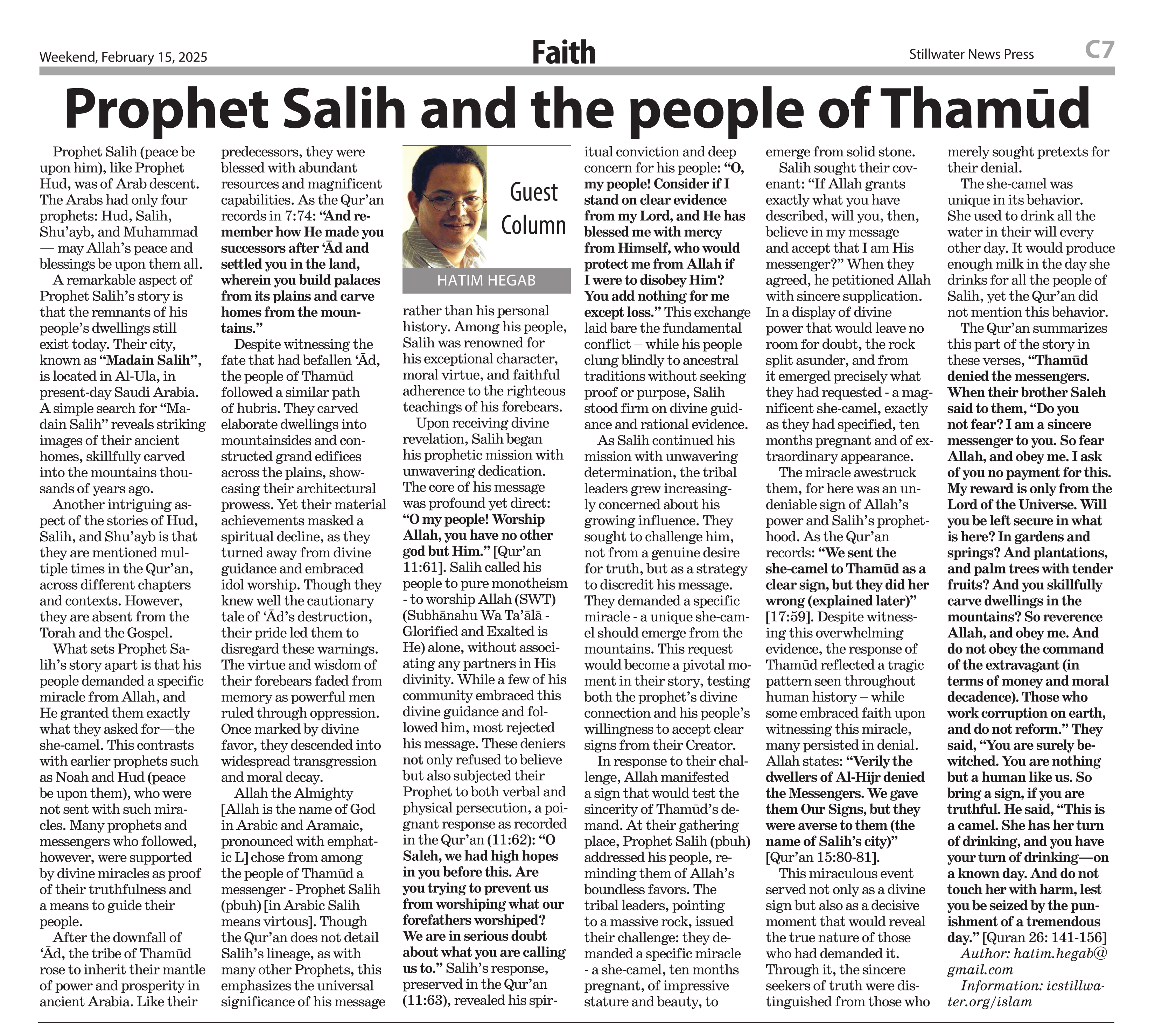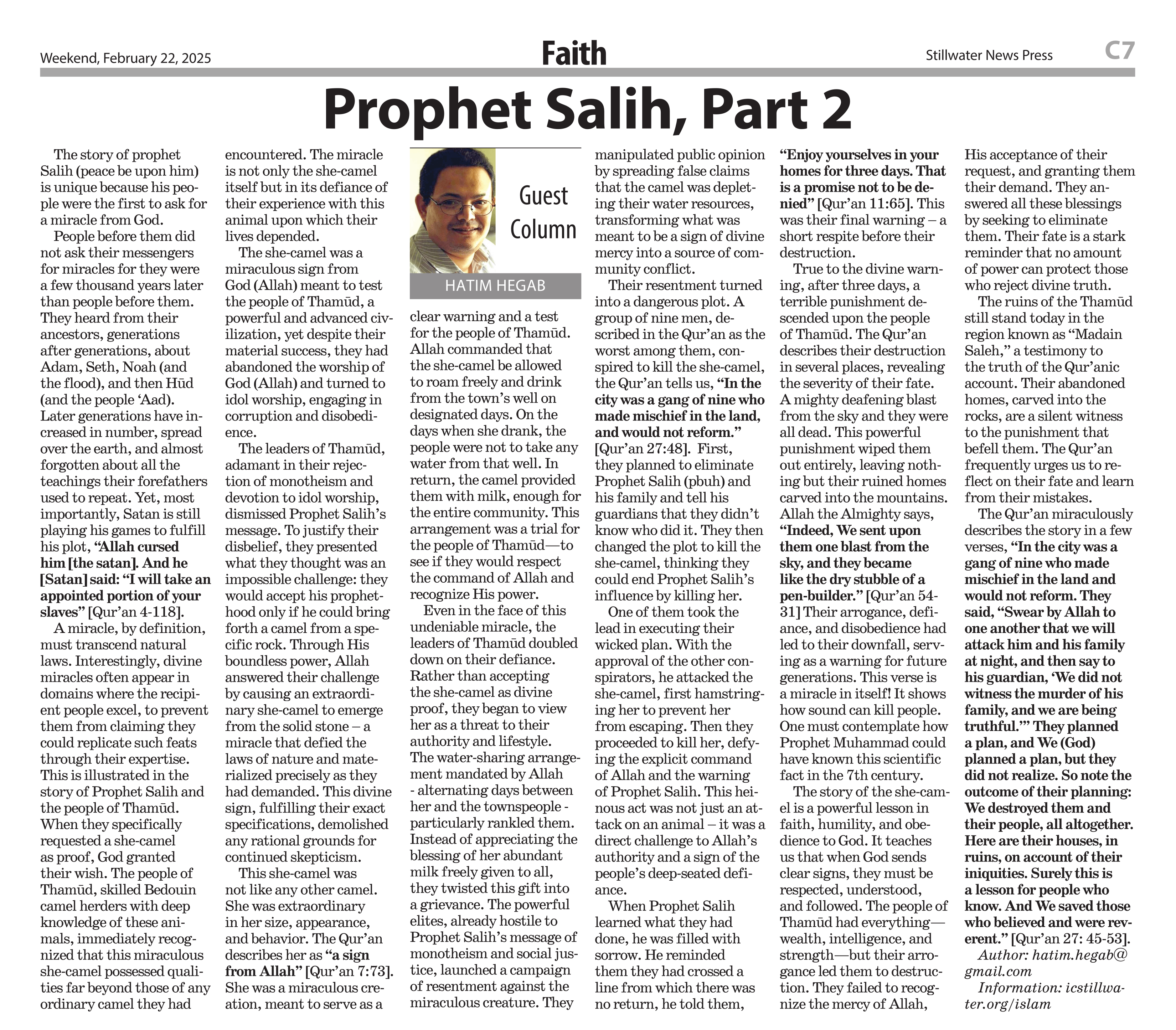 Dr. Hatim Hegab continues to contribute to the Faith page of the local newspaper, “The Stillwater News Press.” In his latest article, he talks about “Prophet Salih, Part 2”.
