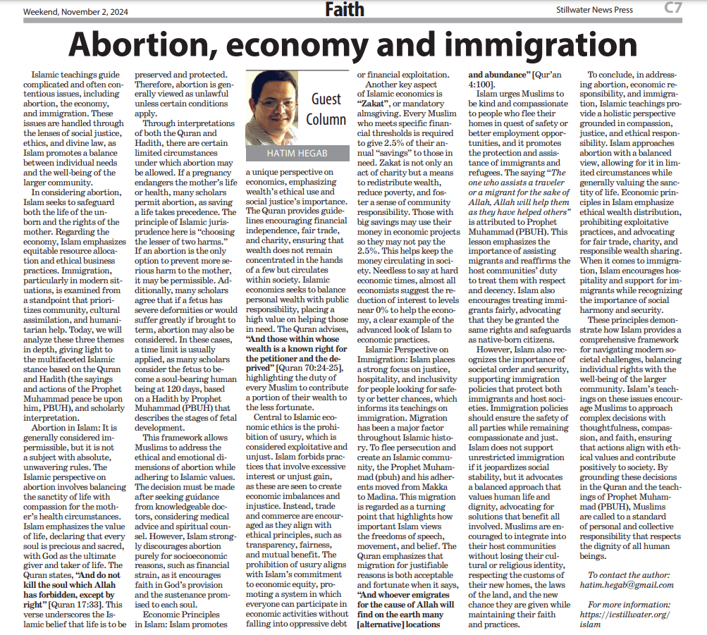Dr. Hatim Hegab continues to contribute to the Faith page of the local newspaper, “The Stillwater News Press.” In his latest article, he discusses “Abortion, economy and immigration”.