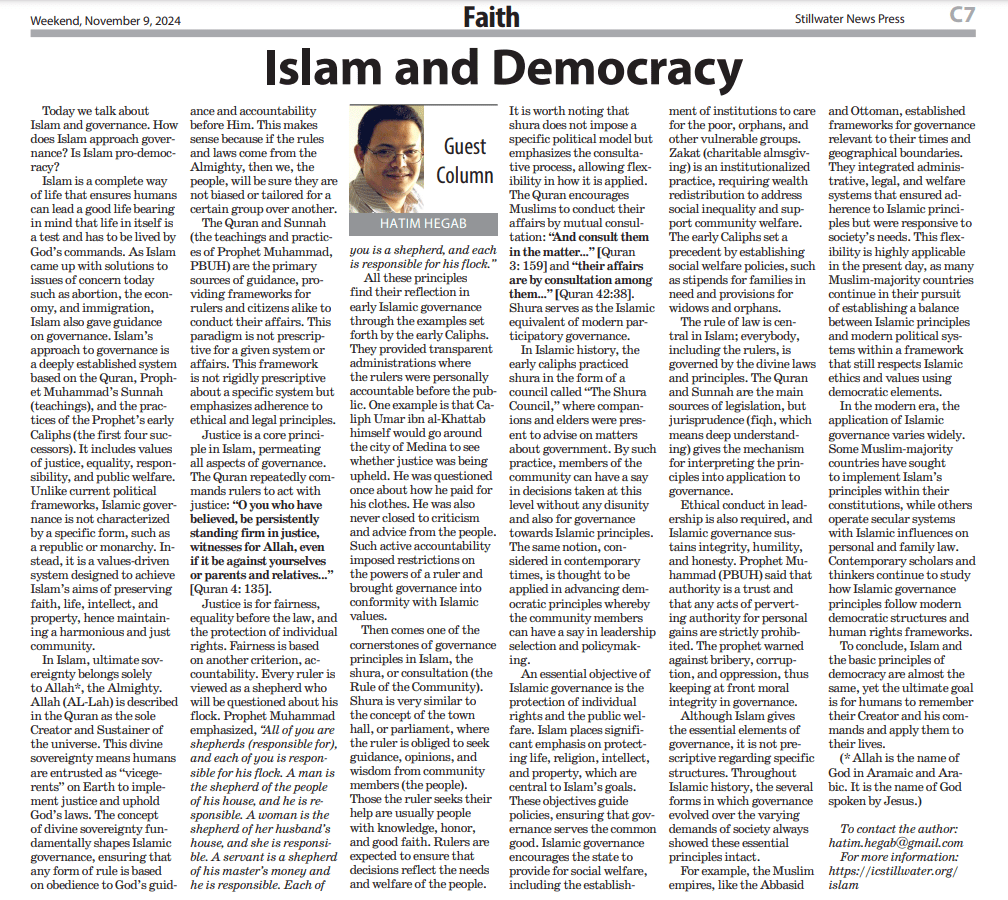 Dr. Hatim Hegab continues to contribute to the Faith page of the local newspaper, “The Stillwater News Press.” In his latest article, he talks about “Islam and Democracy”: