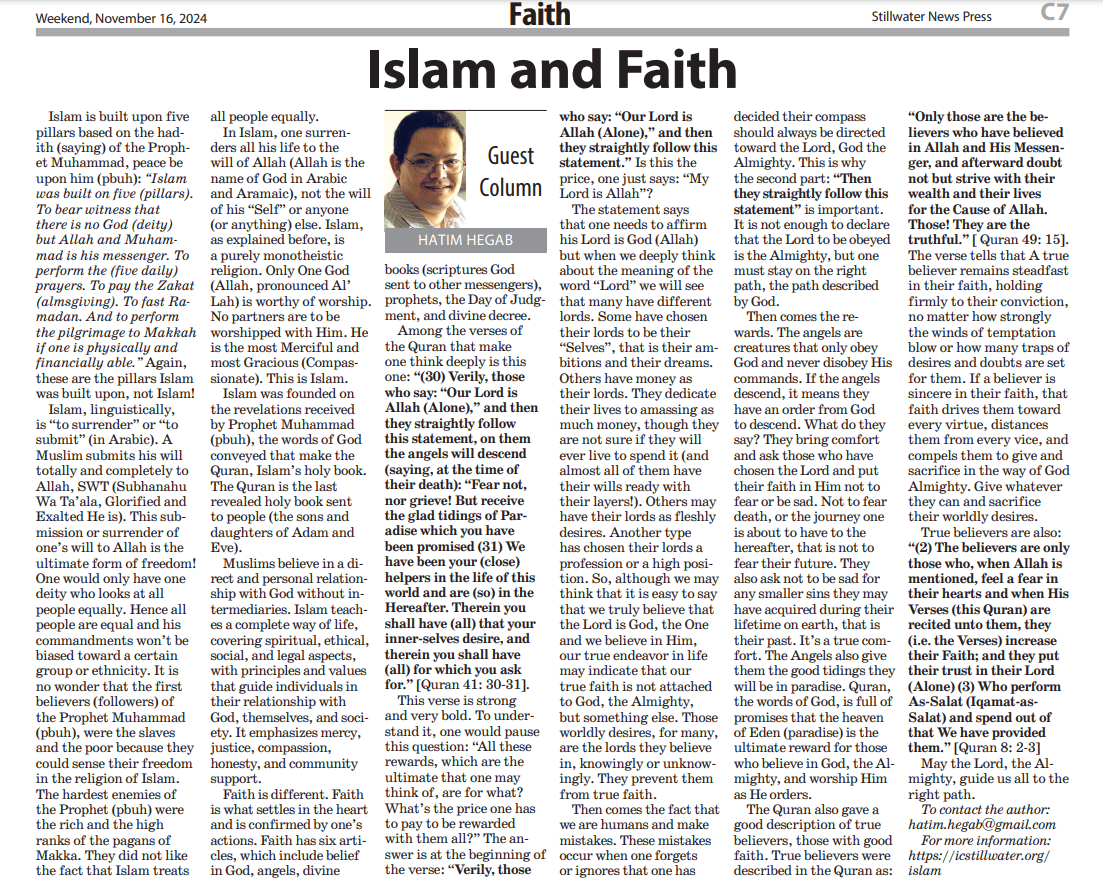 Dr. Hatim Hegab continues to contribute to the Faith page of the local newspaper, “The Stillwater News Press.” In his latest article, he discusses “Islam and Faith”.