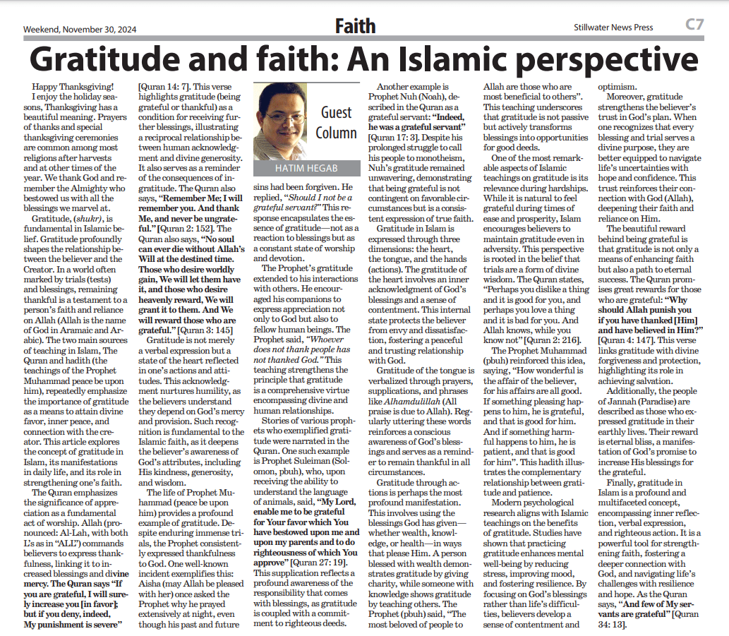 Dr. Hatim Hegab continues to contribute to the Faith page of the local newspaper, “The Stillwater News Press.” In his latest article, he talks about “Gratitude and Faith. An Islamic Perspective”:
