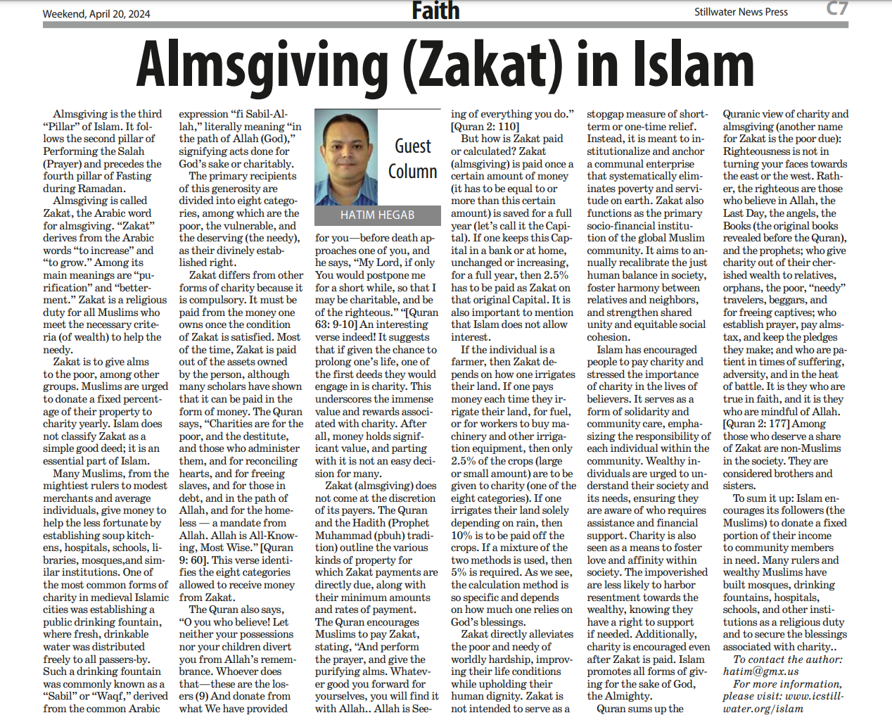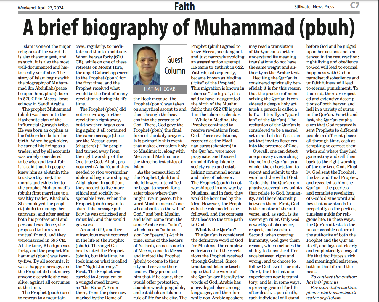 Dr. Hatim Hegab continues his writings on the Faith page for the local newspaper “The Stillwater News Press”. For the first time, an article carries the name of the Prophet Muhammad followed by “peace be upon him” and dedicated to his biography (Sirah). The article goes on to discuss the Quran and Islam’s principles. Remember that the primary and ultimate goal should always be the Da’wah, which is delivering the message and fulfilling the Prophet’s directive to convey verses from the Quran to people.