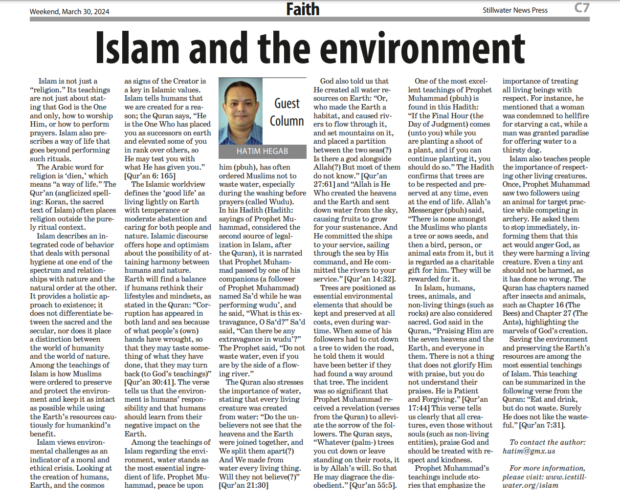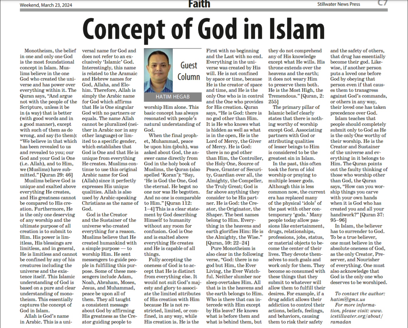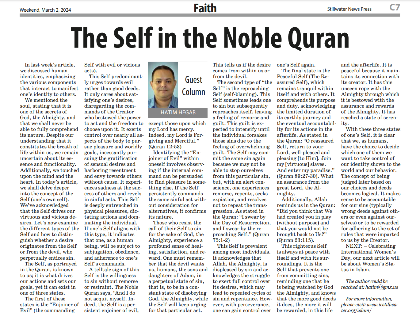 In his article in the Stillwater News Press, the local newspaper of Stillwater, Dr. Hatim Hegab continues his writing on the Faith page.