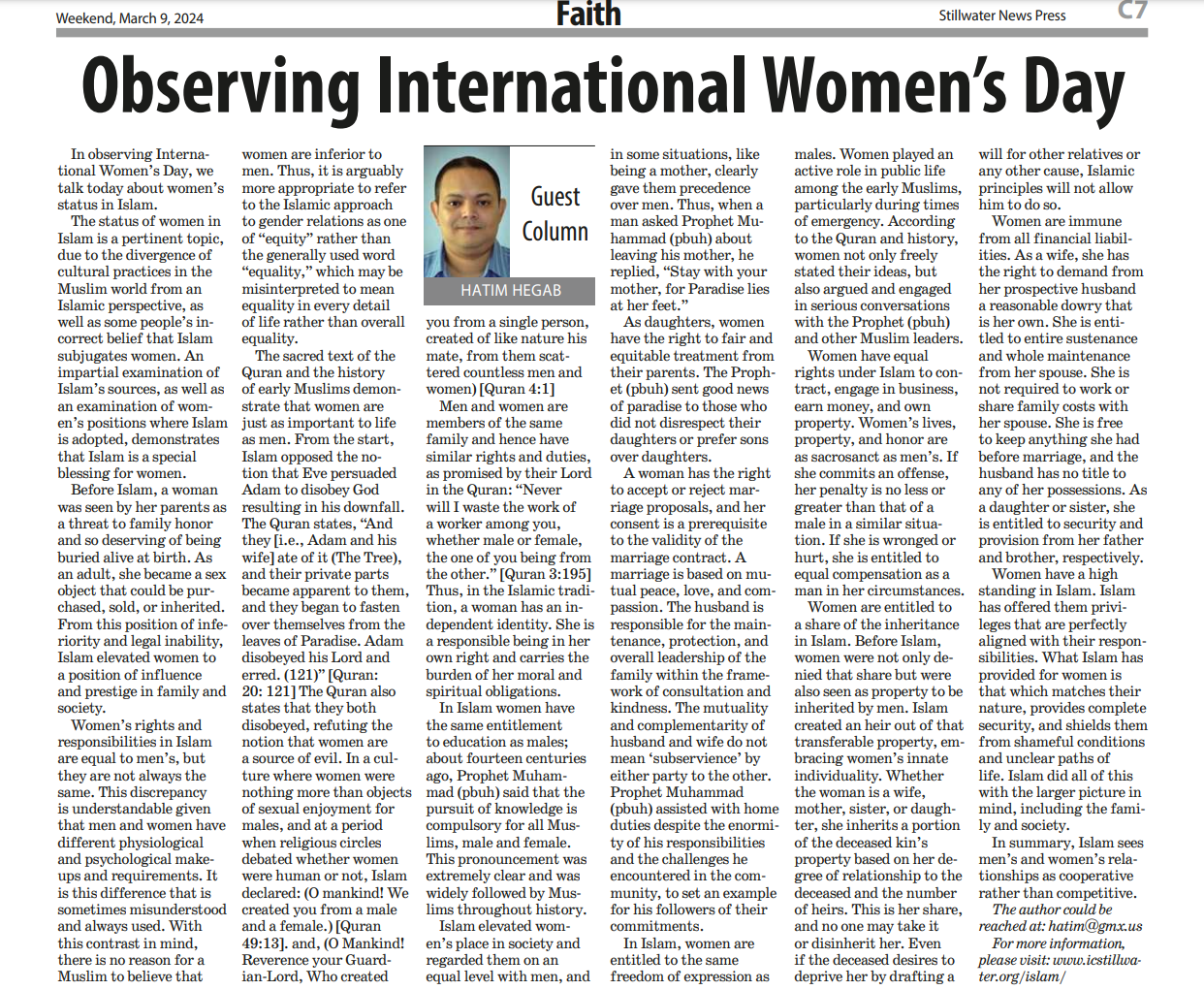 In the local newspaper of Stillwater, the Stillwater News Press, Dr. Hatim Hegab continues his writings on the Faith page. He wrote this piece to commemorate International Women’s Day.