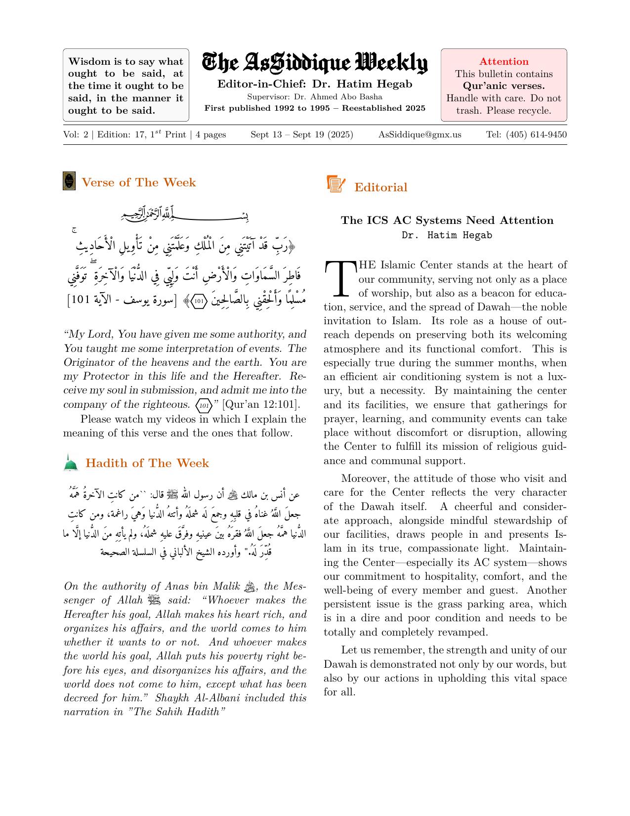 Additionally, as of today, Dr. Hatem Hegab will continue to focus fully on Dawah efforts, as his workload and dedication to spreading the message of Islam only grow. Dr. Hegab’s office at the ICS has become a hub of productive activity, yielding more work for the sake of Allah than many committees combined—work he has carried out single-handedly, totally financed by his own money, with the blessing and help of Allah (SWT). I testify to this sincerely for the sake of Allah.