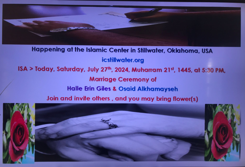 Congratulations to Halle Erin Giles and Osaid Alkhamaiseh. They tied the knot and are having their religious celebration at the Islamic Center in Stillwater.