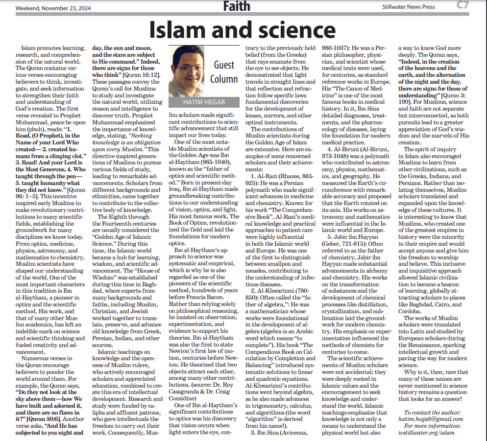 Dr. Hatim Hegab continues to contribute to the Faith page of the local newspaper, “The Stillwater News Press.” In his latest article, he talks about “Islam and Science”: