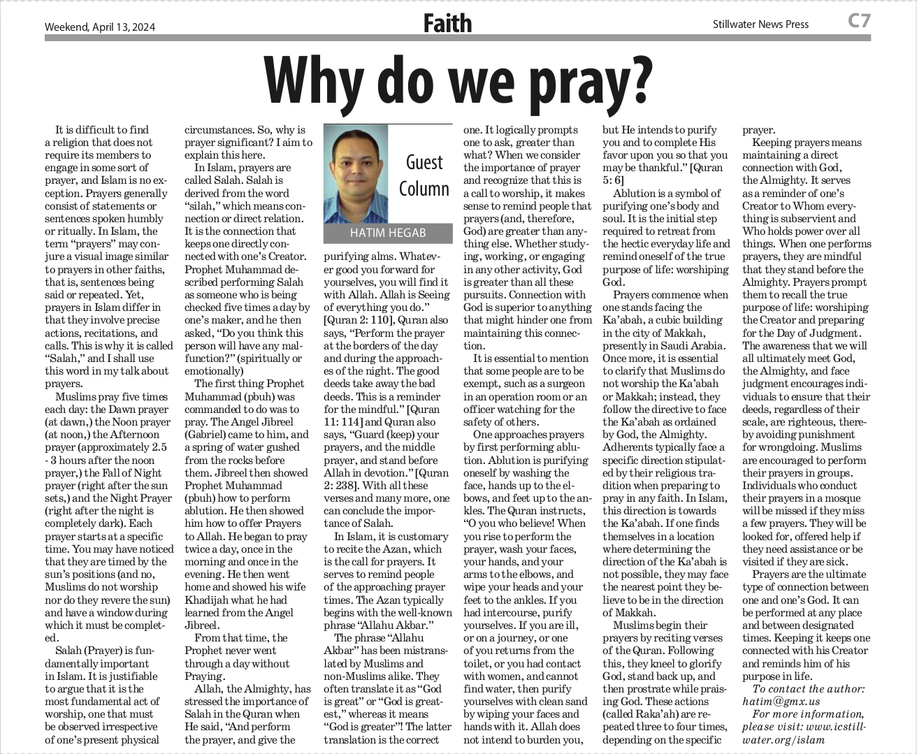 Dr. Hatim Hegab continues his writings on the Faith page for the local newspaper “The Stillwater News Press”. For the first time, an article carries the name of the Prophet Muhammad followed by “peace be upon him” and dedicated to his biography (Sirah). The article goes on to discuss the Quran and Islam’s principles. Remember that the primary and ultimate goal should always be the Da’wah, which is delivering the message and fulfilling the Prophet’s directive to convey verses from the Quran to people.