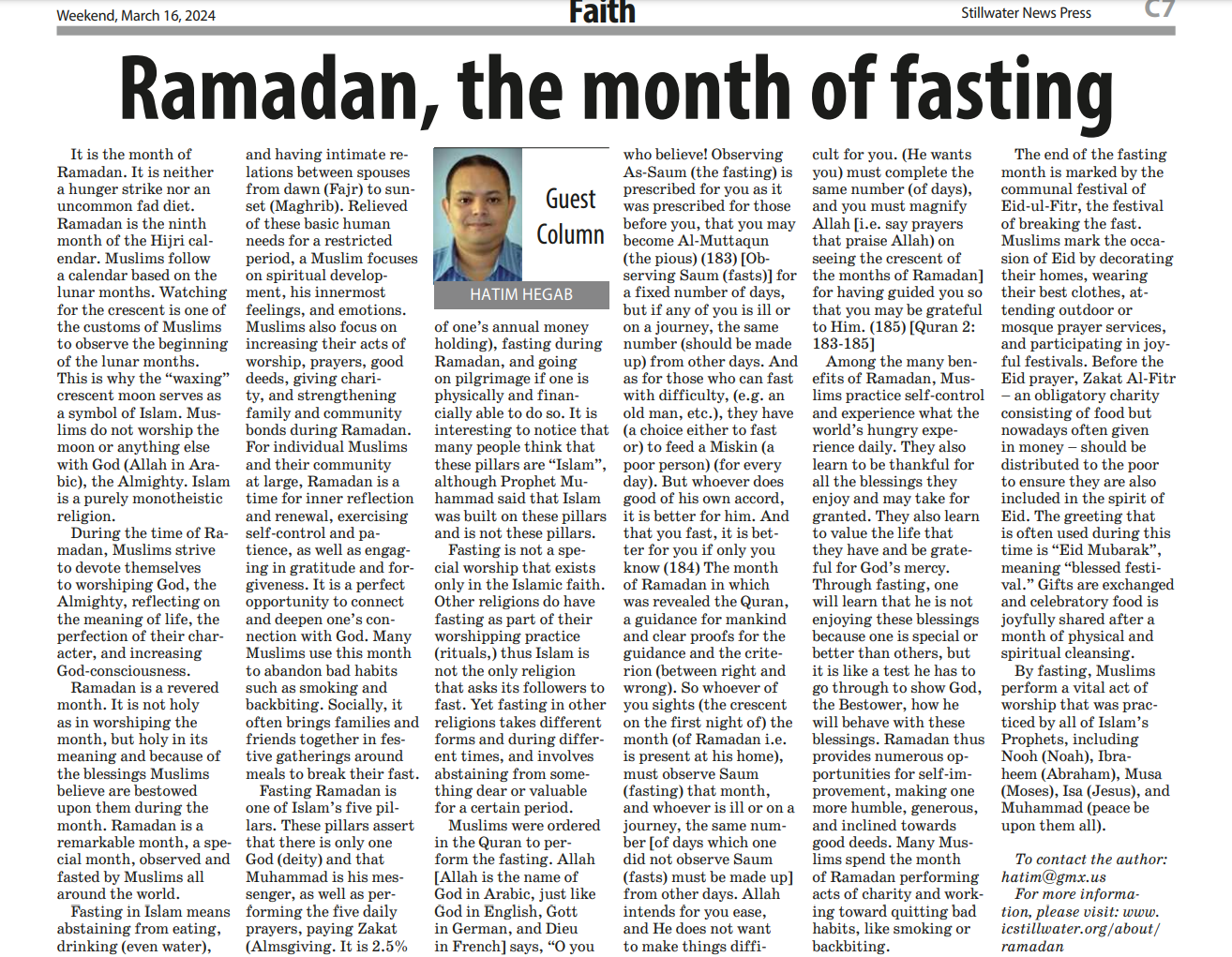 Dr. Hatim Hegab continues his writings on the Faith page for the local newspaper “The Stillwater News Press”. He wrote this piece to commemorate The beginning of the month of Ramadan.